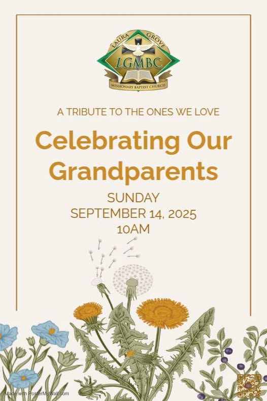 Celebrating Our Grandparents at Laura Grove September 14, 2025 10 am Laura Grove Missionary Baptist Church Grandparents are a gift from God! Join us as we honor and celebrate all grandparents this Grandparents Day!!!!! Bring your family and let’s celebrate!! Sunday, September 14, 2025 at 10 am