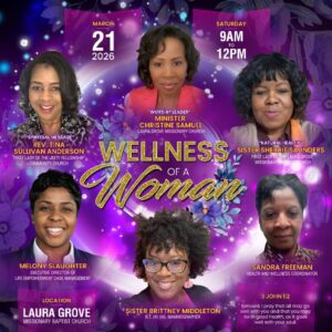 We are excited to announce the presenters for our upcoming Women’s Conference: Wellness of a Woman! God has assembled an amazing group of women who will lead us in worship and share wisdom on physical, mental and spiritual wellness: Worship Leader: Minister Christine Samuel, Natural Health: First Lady Sherrie Saunders, Physical Health and Wellness: Sandra Freeeman and Brittany Middleton, Mental Wellness: Melody Slaughter and spiritual Wellness: Reverend Tina Anderson. We look forward to worshipping and learning together!